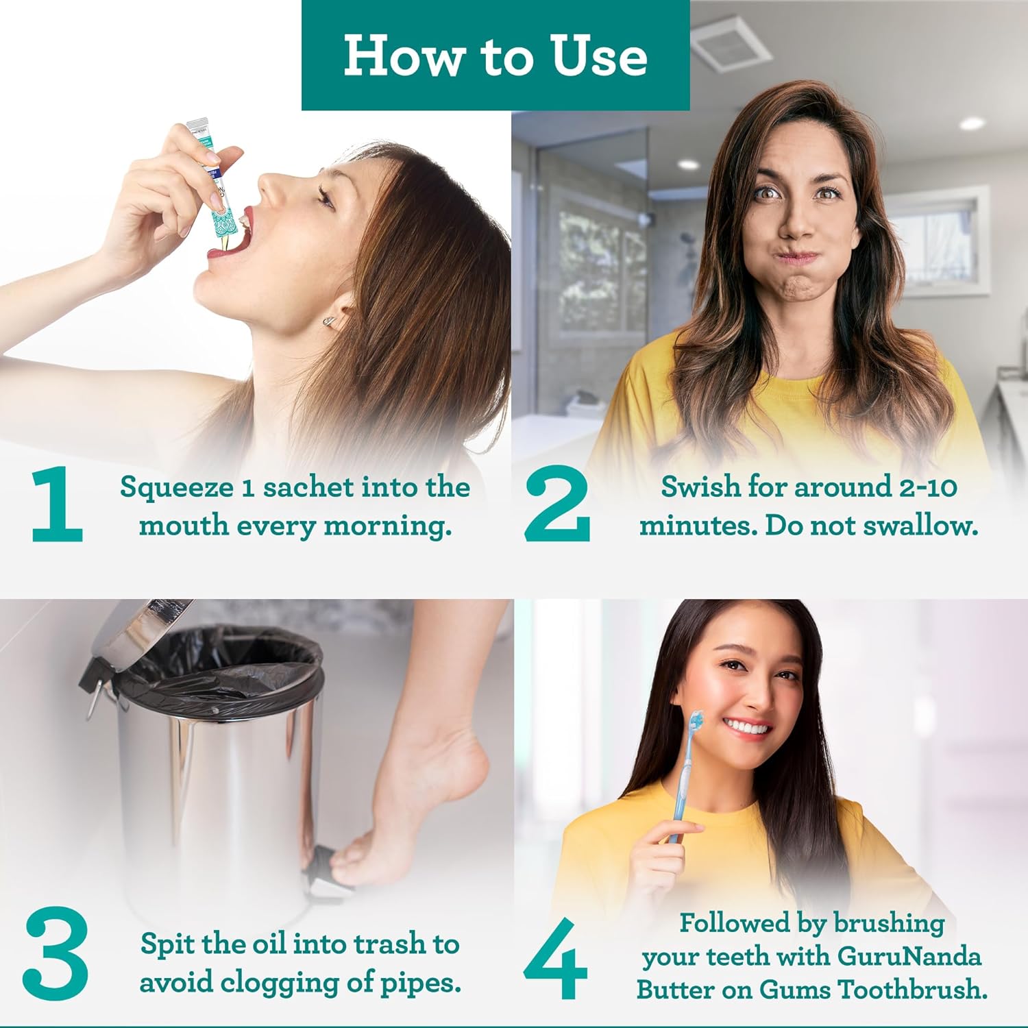 GuruNanda Travel Sachets Coconut Oil Pulling, Fresh Breath Mouthwash, 7 Essential Oils & Vitamins for Happy Teeth & Gums, 7 Sachets
