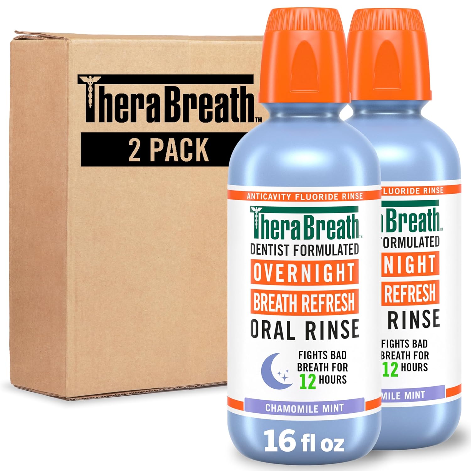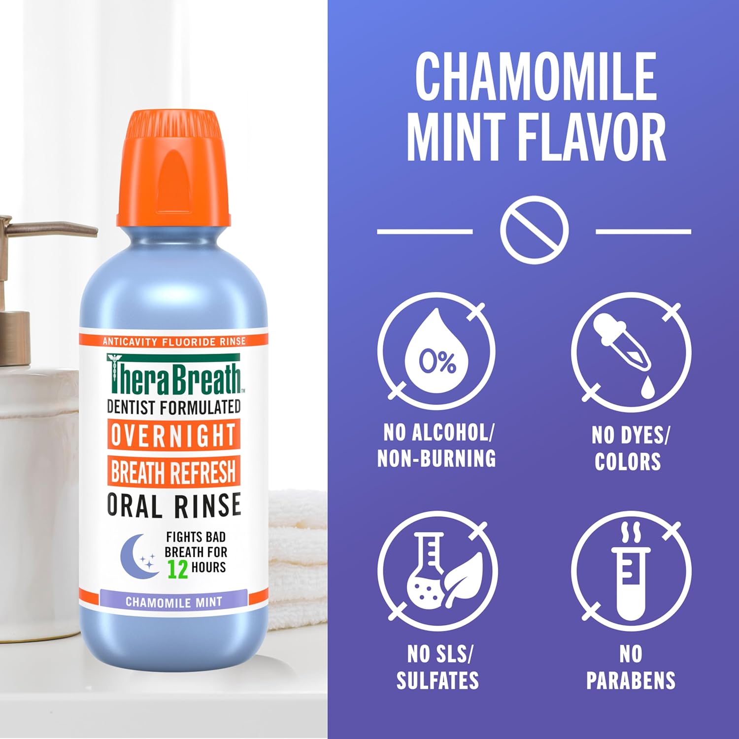 TheraBreath Overnight Mouthwash, Fights Bad Breath for 12 Hours, Chamomile Mint Flavor, Dentist Formulated, Fluoride Rinse, Alcohol Free, 16 fl oz (Pack of 2)